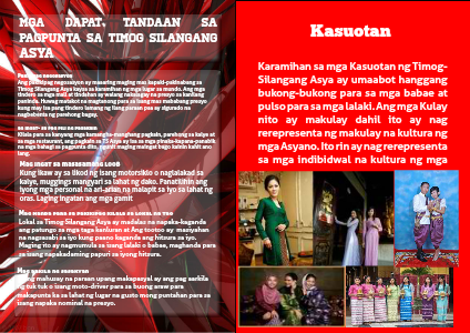 Karamihan sa mga Kasuotan ng Timog-Silangang Asya ay umaabot hanggang bukong-bukong para sa mga babae at pulso para sa mga lalaki. Ang mga Kulay nito ay makulay dahil ito ay nag rerepresenta ng makulay na kultura ng mga Asyano. Ito rin ay nag rerepresenta sa mga indibidwal na kultura ng mga bansa nito.