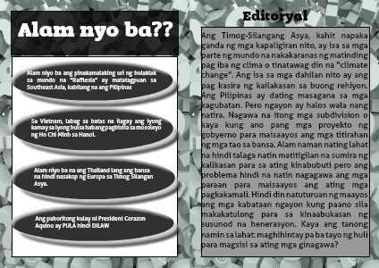 Ang Timog-Silangang Asya, kahit napaka ganda ng mga kapaligiran nito, ay isa sa mga parte ng mundo na nakakaranas ng matinding pag iba ng clima o tinatawag din na "climate change". Ang isa sa mga dahilan nito ay ang pag kasira ng kailakasan sa buong rehiyon. Ang Pilipinas ay dating masagana sa mga kagubatan. Pero ngayon ay halos wala nang natira. Nagawa na itong mga subdivision o kaya kung ano pang mga proyekto ng gobyerno para maisaayos ang mga titirahan ng mga tao sa bansa. Alam naman nating lahat na hindi talaga natin matitigilan na sumira ng kalikasan para sa ating kinabubuti pero ang problema hindi na natin nagagawa ang mga paraan para maisaayos ang ating mga pagkakamali. Hindi din natuturuan ng maayos ang mga kabataan ngayon kung paano sila makakatulong para sa kinaabukasan ng susunod na henerasyon. Kaya ang tanong namin sa lahat: maghihintay pa ba tayo ng huli para magsisi sa ating mga ginagawa?