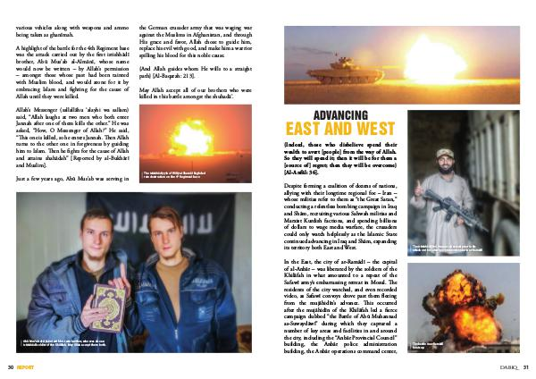 A highlight of the battle for the 4th Regiment base was the attack carried out by the first istishhādī brother, Abū Mus’ ab al-Almānī, whose name would now be written – by Allah’ s permission – amongst those whose past had been tainted with Muslim blood, and would atone for it by embracing Islam and fighting for the cause of Allah until they were killed. the German crusader army that was waging war against the Muslims in Afghanistan, and through His grace and favor, Allah chose to guide him, replace his evil with good, and make him a warrior spilling his blood for this noble cause.