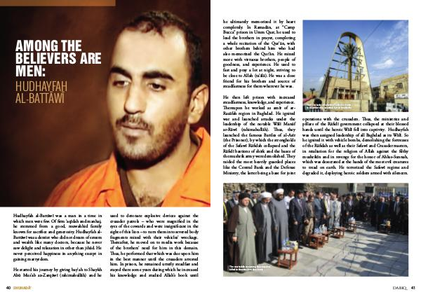 operations with the crusaders. Thus, the ministries and pillars of the Rāfidī government collapsed at their blessed hands until the heroic Wālī fell into captivity. Hudhayfah was then assigned leadership of all Baghdad as its Wālī. So he ignited it with vehicle bombs, demolishing the fortresses of the Rāfidah as well as their Safawī and Crusader masters, in retaliation for the religion of Allah against the filthy mushrikīn and in revenge for the honor of Ahlus-Sunnah, which was desecrated at the hands of the most evil creatures to tread on earth. He terrorized the Safawī regime and degraded it, deploying heroic soldiers armed with silencers.