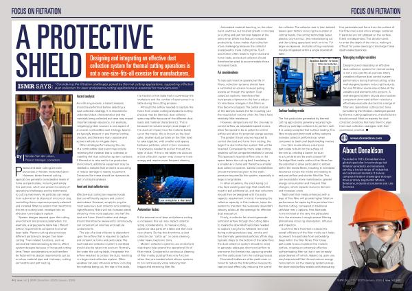 Designing and integrating an effective dust collection system for thermal cutting is not a one-size-fits-all exercise. Many variables influence dust control system performance during thermal cutting, and a well-designed system including the ducts, fan and filtration media should take all the variables and elements into account. A well-designed system should also maintain consistent downward airflow velocity to effectively evacuate dust across a range of filter and operational cutting conditions. Considering the filtration challenges posed by thermal cutting applications, manufacturers should consult filtration experts for dustcollection solutions that help them to align their dust collection strategies with their operational priorities. n