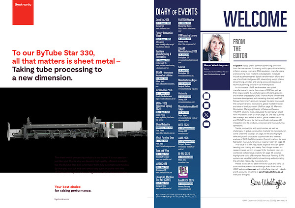 In this issue of ISMR, we interview two global manufacturers to gauge their views of 2025 as well as their responses to these challenges with plans, projects and market forecasts for 2026. Thomas Krone( Voortman’ s business development and marketing director) and Stef Rohaan( Voortman’ s product manager for plate) discussed the company’ s latest innovations, global market strategy and view of the future with ISMR on page 20. Marcella Montelatici, Managing Director of Sales and Service, TRUMPF Machine Tools, discussed the company’ s latest new innovations with ISMR on page 28. She also outlined her strategic and technical vision, global market trends and TRUMPF’ s plans for further artificial intelligence( AI) integration into its products, processes and manufacturing operations.