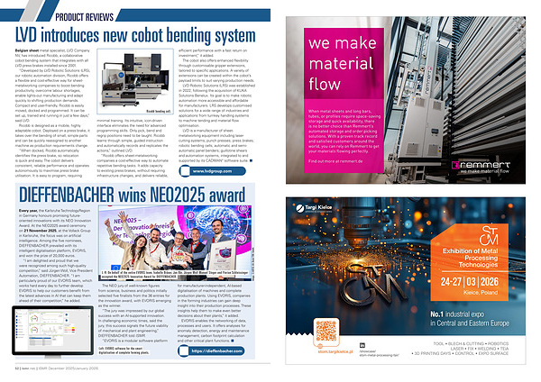Every year, the Karlsruhe TechnologyRegion in Germany honours promising futureoriented innovations with its NEO Innovation Award. At the NEO2025 award ceremony on 21 November 2025, at the Vollack Group in Karlsruhe, the focus was on artificial intelligence. Among the five nominees, DIEFFENBACHER prevailed with its intelligent digitalisation platform, EVORIS, and won the prize of 20,000 euros.
