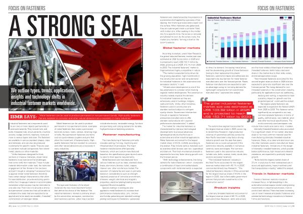 Trends in fastener markets include an increased focus on lightweighting in the automotive and aerospace sectors and growing investments in industrial automation, motion control and robotics. There has been increasing use of novel threaded and plastic fasteners and substantial technology innovations in fastener forms and functions.