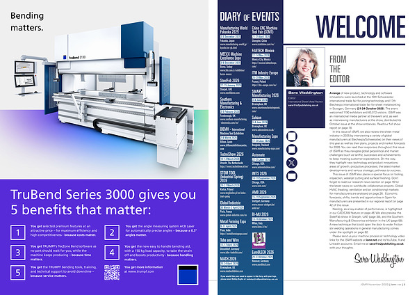 In this issue of ISMR, we also review the sheet metal industry in 2025 by interviewing a variety of global manufacturers at Blechexpo / Schweisstec on their views of this year as well as their plans, projects and market forecasts for 2026. You can read their responses throughout this issue of ISMR as they navigate global geopolitical and market challenges( such as tariffs), successes and achievements to keep meeting customer expectations. On the way, they highlight new technology and product innovations; areas of growth; productive processes; the latest market developments and various strategic pathways to success.