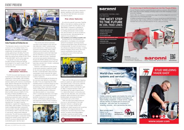www. steelfabme. com / welding-competition. html Overseas pavilions, seminars / technical presentations, live displays and a dedicated vertical for the fastener and fixing industry( Fasteners World Middle East) will also be held at SteelFab 2026. The event will also focus on the software and digital technologies, including artificial intelligence( AI) as well as the move towards sustainability, that are helping to shaping the future of the sheet-metal processing industry.