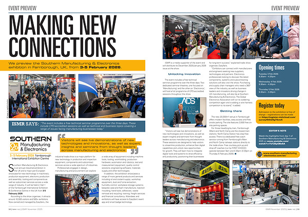 We preview the Southern Manufacturing & Electronics exhibition in Farnborough, UK, from 3-5 February 2026.