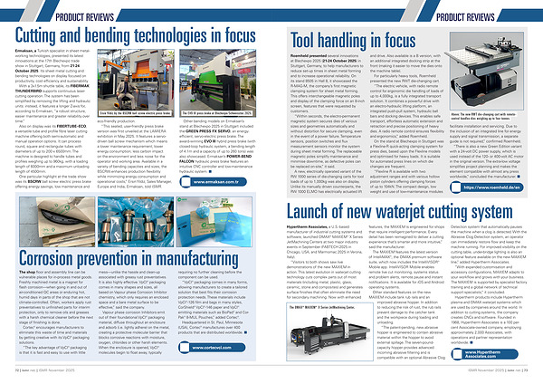 Other bending models on Ermaksan’ s stand at Blechexpo 2025 in Stuttgart included the GREEN PRESS FX SERVO, an energyefficient, servo-electric press brake. The award-winning EVO III hybrid press brake( with closed-loop hydraulic system, a bending length of 4.1m and a capacity of up to 260 tons) was also showcased. Ermaksan’ s POWER-BEND FALCON hydraulic press brake features an intuitive CNC controller and low-maintenance hydraulic system. n