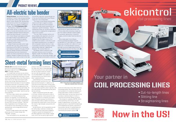 Sharpe Products , one of North America ’ s specialists in custom tube and pipe bending and tube laser cutting , has ordered the allelectric Unison Breeze CNC tube-bending machine that will form the centrepiece of Unison Tube LLC ’ s display at FABTECH in Chicago , USA ( 11-14 September 2023 ). The machine , a 100mm ( 4 ”) singlestack model , will be on display at Unison ’ s FABTECH Booth (# D41930 ) after which it will be installed at Sharpe Products ’ Wisconsinbased manufacturing plant . It will be the ninth Unison Breeze tube bender purchased by Sharpe Products since 2003 and will be used to provide additional capacity for bending tubular components for the company ’ s customer base .