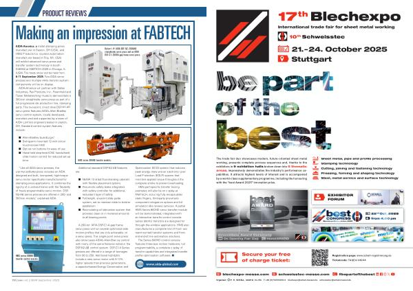 AIDA-America, a metal stamping press manufacturer in Dayton, OH( USA), and HMS Products Co.( a press automation manufacturer based in Troy, MI, USA) will exhibit advanced servo press and transfer system technology in booth D40902 at FABTECH 2025 in Chicago, IL( USA). The trade show will be held from 8-11 September 2025. Two AIDA servo presses and multiple HMS transfer system components will be on display.
