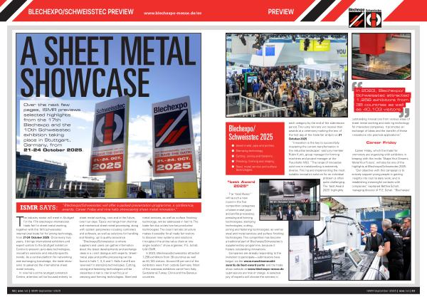 Over the next few pages, ISMR previews selected highlights from the 17th Blechexpo and the 10th Schweisstec exhibition taking place in Stuttgart, Germany, from 21-24 October 2025.