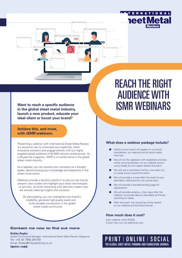 Presenting a webinar with International Sheet Metal Review is a powerful way to showcase your expertise, share innovative solutions and engage directly with our highly targeted global audience of 64,000 industry professionals. As a 26-year-old magazine, ISMR is a trusted name in the global sheet metal industry.