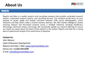 Reports and Data is a market research and consulting company that provides syndicated research reports , customized research reports , and consulting services . Our solutions purely focus on your purpose to locate , target and analyze consumer behavior shifts across demographics , across industries and help client ’ s make a smarter business decision . We offer market intelligence studies ensuring relevant and fact-based research across a multiple industries including Healthcare , Technology , Chemicals , Power , and Energy . We consistently update our research offerings to ensure our clients are aware about the latest trends existent in the market . Reports and Data has a strong base of experienced analysts from varied areas of expertise .