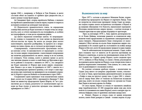 През м . септември 1978 г ., бяха приети договореностите от Кемп Дейвид , полагащи рамката за комплексен мир , включи-телно предложение за ограничено самоуправление за палес-тинците . ( Предложението беше отхвърлено от палестинците .) Шест месеца по-късно беше подписано мирно споразумение и бе сложен край на състоянието на война между Израел и Еги-пет , което бе продължило тридесет и една години .