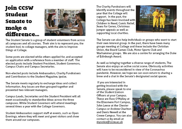 If you are interested in getting involved with the Senate, please speak to one of the Student Liaison Officers at your Campus. These are Russ O'Malley at the Ellesmere Port Campus, John Leese at the Chester Campus or Andrew Charlton and Denis Newell at the Crewe Campus. You can also contact us by email at myvoice@ccsw.ac.uk