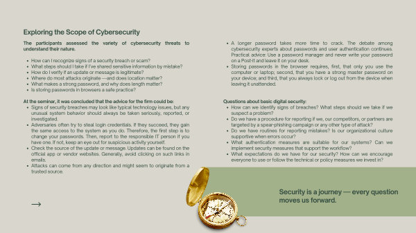 At the seminar, it was concluded that the advice for the firm could be: Signs of security breaches may look like typical technology issues, but any unusual system behavior should always be taken seriously, reported, or investigated. Adversaries often try to steal login credentials. If they succeed, they gain the same access to the system as you do. Therefore, the first step is to change your passwords. Then, report to the responsible IT person if you have one. If not, keep an eye out for suspicious activity yourself. Check the source of the update or message. Updates can be found on the official app or vendor websites. Generally, avoid clicking on such links in emails. Attacks can come from any direction and might seem to originate from a trusted source.