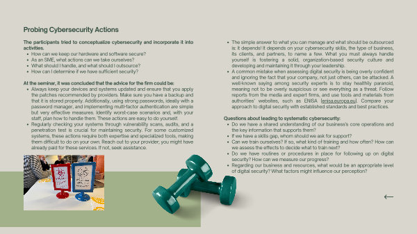 The participants tried to conceptualize cybersecurity and incorporate it into activities. How can we keep our hardware and software secure? As an SME, what actions can we take ourselves? What should I handle, and what should I outsource? How can I determine if we have sufficient security?