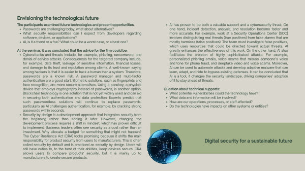 At the seminar, it was concluded that the advice for the firm could be: Cyberattacks and threats include, for example, phishing, ransomware, and denial-of-service attacks. Consequences for the targeted company include, for example, data theft, leakage of sensitive information, financial losses, and damage to its trust and reputation among clients. A well-known saying among hackers is that it is easier to hack a human than a system. Therefore, passwords are a known risk. A password manager and multi-factor authentication are a good start. Biometric solutions, such as fingerprints and face recognition, are more secure alternatives. Using a passkey, a physical device that employs cryptography instead of passwords, is another option. Blockchain technology is one solution that is not yet widely used and can aid in securing both authentication and data protection. Experts predict that such passwordless solutions will continue to replace passwords, particularly as AI challenges authentication, for example, by cracking strong passwords within seconds. Security by design is a development approach that integrates security from the beginning rather than adding it later. However, changing the development process requires a shift in mindset, which has proven difficult to implement. Business leaders often see security as a cost rather than an investment. Why allocate a budget for something that might not happen? The Cyber Resilience Act( CRA) looks promising because it shifts the main responsibility for product security from users to manufacturers. This is often called security by default and is practiced as security by design. Users will still have duties to, to the best of their abilities, keep devices secure. CRA allows users to compare products ' security, but it is mainly up to manufacturers to create secure products.