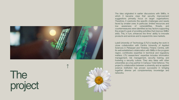 Luleå University of Technology( LTU) is leading the work in close collaboration with Centria University of Applied Sciences in Pietasaari and Ylivieska, Finland. Centria, with its well-established collaboration with SMEs in the program region, contributes expertise in technical and regulatory matters. LTU researchers’ expertise includes information management, risk management, security training, and fostering a security culture. They also liaise with other universities as a key partner in Campus Total Defence. The project’ s collaboration between a university and an applied science institution has proven successful in bringing together diverse yet complementary knowledge and networks. project