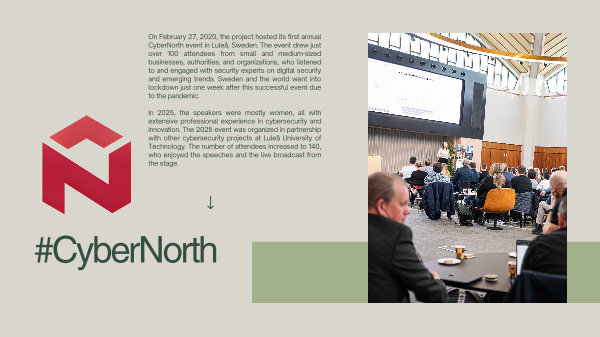 On February 27, 2020, the project hosted its first annual CyberNorth event in LuleƄ, Sweden. The event drew just over 100 attendees from small and medium-sized businesses, authorities, and organizations, who listened to and engaged with security experts on digital security and emerging trends. Sweden and the world went into lockdown just one week after this successful event due to the pandemic.