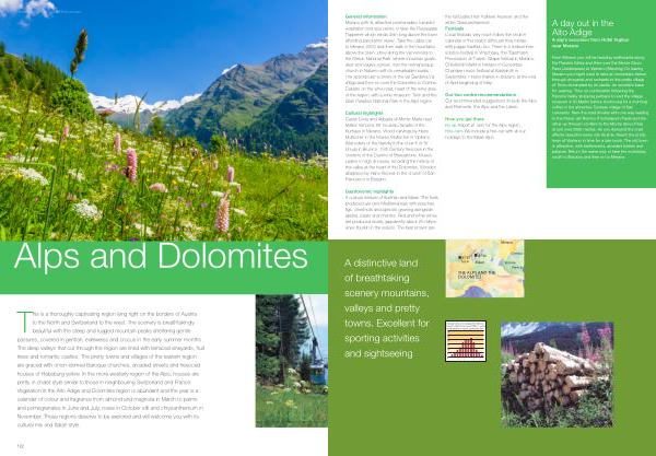 General information Merano with its attractive promenades , luxuriant vegetation and spa centre or take the Passegiata Tappeiner which winds 4km long above the town affording panoramic views . Take the cable�car to Merano 2000 and then walk in the mountains above the town . Drive along the Val Venosta to the Stelvio National Park , where mountain goats , deer and eagles survive . Visit the Romanesque church in Naturno with its remarkable murals . The spectacular scenery of the Val Gardena Val d ’ Ega and then on over the Dolomites to Cortina . Caldaro on the wine road , heart of the wine area of the region , with a wine museum . Turin and the Gran Paradiso National Park in the Alps region .