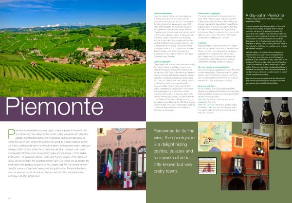 Piemonte is essentially a country region of alpine peaks in the north , flat rice�producing river valleys further south , rolling vineyards with attractive villages , forested hills dotted with mediaeval castles and almost at its centre the city of Turin , known throughout the world as a great industrial centre but in fact , outstandingly rich in architectural gems , both modern and in particular Baroque . North of Turin is the Parco Nazionale del Gran Paradiso , with miles of unspoiled natural scenery of mountain peaks and meadows , of rare wildlife and flowers . The splendid palaces , parks and hunting lodges of the Princes of Savoy can be visited in the countryside near Turin . Our hotels are situated in the remarkable wine�producing regions of the Langhe and Asti , renowned for their beautiful scenery , magnificent wines and fine gastronomy . Piemonte beckons lovers of wine and food , art and architecture and dramatic , natural but also gloriously cultivated landscapes .