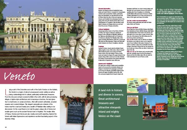 the Veneto is a region of almost unsurpassed scenic variety as well as being outstandingly rich in cultural , particularly architectural , treasures . From the vine and orchard covered foothills in the north , with its wine�producing villages of alpine�style architecture and romanesque churches , the land gives rise to small towns on canals and rivers , often with ancient cathedrals , arcaded squares and covered bridges . Tall , elegant campanile are a feature of the towns near the coast and nearby are a wealth of Palladian villas waiting to be discovered . On the coast there is not only the great , unique city of Venice but smaller gems such as the ancient Roman town of Aquileia . The smaller cities of Padua , Vicenza and Verona are also nearby and worth exploring . Explore the Veneto with Italian Expressions and experience another fascinating aspect of the diversity of Italy .