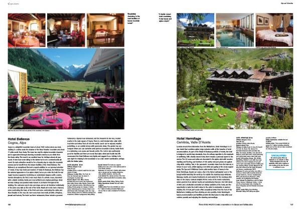 restaurant , a typical local restaurant , and the Brasserie du Bon Bec , located nearby in the main square of Cogne . There is a well stocked wine cellar with local wine and wines from all over the world . Lunch can be enjoyed , weather permitting , on an outside terrace with panoramic views . The garden has sun loungers where you can sunbathe amid glorious mountain scenery . Inside there is a swimming pool , sauna and beauty centre . The hotel is also particularly good for families and there are rooms that take a third and fourth bed . We recommend the Hotel Bellevue very highly and suggest it as a holiday in its own right for relaxing in the mountains or as a two centre combination perhaps with the Italian Lakes .