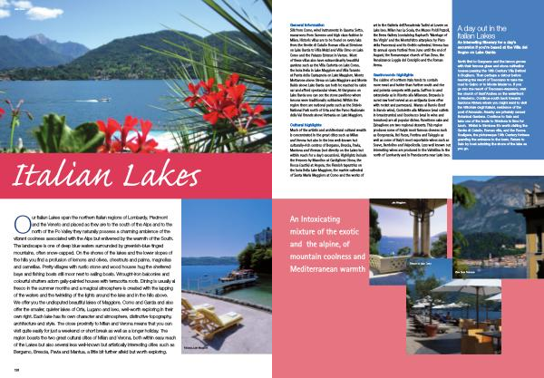 and the Veneto and placed as they are to the south of the Alps and to the north of the Po Valley they naturally possess a charming ambience of the vibrant coolness associated with the Alps but enlivened by the warmth of the South . The landscape is one of deep blue waters surrounded by greenish�blue tinged mountains , often snow�capped . On the shores of the lakes and the lower slopes of the hills you find a profusion of lemons and olives , chestnuts and palms , magnolias and camellias . Pretty villages with rustic stone and wood houses hug the sheltered bays and fishing boats still moor next to sailing boats . Wrought�iron balconies and colourful shutters adorn gaily�painted houses with terracotta roofs . Dining is usually al fresco in the summer months and a magical atmosphere is created with the lapping of the waters and the twinkling of the lights around the lake and in the hills above . We offer you the undisputed beautiful lakes of Maggiore , Como and Garda and also offer the smaller , quieter lakes of Orta , Lugano and Iseo , well�worth exploring in their own right . Each lake has its own character and atmosphere , distinctive topography , architecture and style . The close proximity to Milan and Verona means that you can visit quite easily for just a weekend or short break as well as a longer holiday . The region boasts the two great cultural cities of Milan and Verona , both within easy reach of the Lakes but also several less well�known but artistically interesting cities such as Bergamo , Brescia , Pavia and Mantua , a little bit further afield but worth exploring .