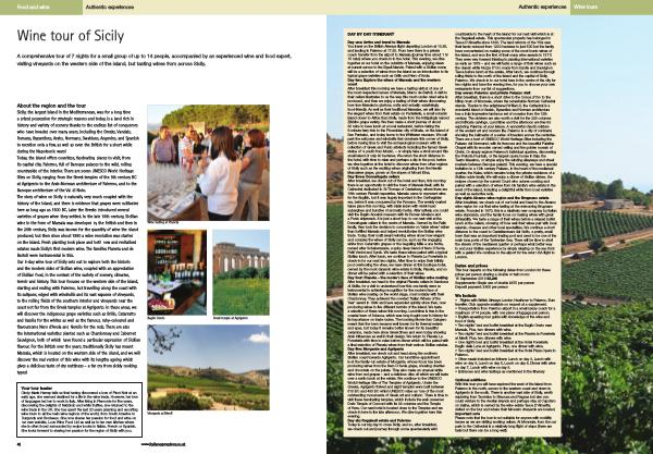 About the region and the tour Sicily , the largest island in the Mediterranean , was for a long time a prized possession for strategic reasons and today , is a land rich in history and variety of scenery thanks to the endless list of conquerors who have invaded over many years , including the Greeks , Vandals , Romans , Byzantines , Arabs , Normans , Swabians , Angevins , and Spanish to mention only a few , as well as even the British for a short while during the Napoleonic wars ! Today , the island offers countless , fascinating places to visit , from its capital city , Palermo , full of Baroque palaces to the wild , rolling countryside of the interior . There are seven UNESCO World Heritage Sites on Sicily , ranging from the Greek temples of the 6th century BC at Agrigento to the Arab-Norman architecture of Palermo , and to the Baroque architecture of the Val di Noto . The story of wine on Sicily is naturally very much coupled with the history of the island , and there is evidence that grapes were cultivated here as long ago as 1500 BC . Later the Greeks introduced several varieties of grapes when they settled . In the late 18th century , Sicilian wine in the form of Marsala was developed by the British and then in the 20th century , Sicily was known for the quantity of wine the island produced , but then since about 1980 a wine revolution was started on the island . Fresh planting took place and both new and revitalised estates made Sicily ’ s first modern wine . The families Planeta and de Bartoli were instrumental in this . Our 8-day wine tour of Sicily sets out to explore both the historic and the modern sides of Sicilian wine , coupled with an appreciation of Sicilian food , in the context of the variety of scenery , climates , terroir and history . This tour focuses on the western side of the island , starting and ending with Palermo , but travelling along the coast with its saltpans , edged with windmills and its vast expanse of vineyards , to the rolling fields of the southern interior and vineyards near the coast not far from the Greek temples at Agrigento . In these areas , we will discover the indigenous grape varieties such as Grillo , Catarratto and Inzolia for the whites as well as the famous , ruby-coloured and flavoursome Nero d ’ Avola and Nerello for the reds . There are also the international varieties planted such as Chardonnay and Cabernet Sauvignon , both of which have found a particular expression of Sicilian flavour . For the British over the years , traditionally Sicily has meant Marsala , which is located on the western side of the island , and we will discover the real version of this wine with its lengthy ageing which gives a delicious taste of dry nuttiness – a far cry from sickly cooking types !