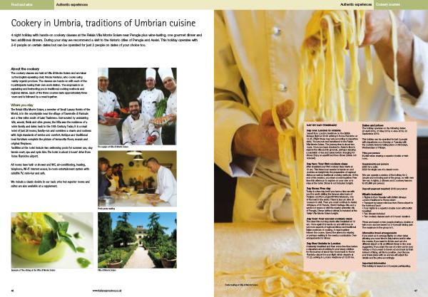 4 night holiday with hands-on cookery classes at the Relais Villa Monte Solare near Perugia plus wine-tasting , one gourmet dinner and two additional dinners . During your stay we recommend a visit to the historic cities of Perugia and Assisi . This holiday operates with 2-6 people on certain dates but can be operated for just 2 people on dates of your choice too .