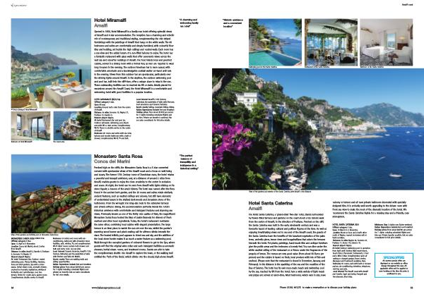 Bedrooms 20 suites and rooms with airconditioning , bathroom with Jerusalem stone facilities , safe , minibar , TV , and complimentary Wi-Fi . Most rooms contain both shower and bath and every room has sea view . Local interest Ceramic factories , Amalfi ’ s 13th Century Cathedral , and the waterfalls at Valle delle Ferriere and Valle dei Mulini . Sports nearby There are walking trails and sailing opportunities . Italian Expressions include Bed and breakfast . Holiday prices From about £ 2140 per person for 7 nights including scheduled flights and private car transfer . Ask our sales consultants for full price details .