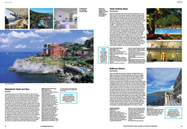 HOTEL ANTICHE MURA EXH469 Official category 4 star . Open 15 March to 5 January Location Sorrento , on the Viale Enrico Caruso leading onto one of the main squares . Distance in miles Naples 30 , Amalfi 20 , Positano 11 , Rome 165 . Nearest airports Naples . At hotel Outdoor swimming pool , Solarium , Massage , Park , Garden , Views of the Valley of the Mills , Sun loungers , Bar , Snack bar , Breakfast buffet , Ironing room , Excursion booking service , Concierge . Bedrooms 46 rooms with en suite bath or shower , view of either the piazza or the garden , telephone , satellite TV , complimentary Wi-Fi , air conditioning , mini bar , safe , hairdryer . Most rooms have a balcony or terrace . Local interest The hotel has part of Sorrento ’ s ancient wall on its grounds and over looks the Valley of the Mills , Boat trips to Capri , Train to Pompeii and Naples . Sports nearby Bicycle hire , watersports and sailing . Italian Expressions include Bed and breakfast . Holiday prices From about £ 1360 per person for 7 nights including scheduled flights and car hire . Ask our sales consultants for full price details .