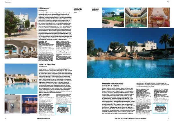 Bedrooms 41 rooms , each with bath or shower and wc , satellite television , telephone , air�conditioning , mini-bar , safe and wifi . Local interest Monopoli , with its lively port and pretty historic centre , Grotte di Castellana , Alberobello , with its mediaeval ‘ trulli ’, Martina Franca , Castel del Monte , Ruins of Egnazia , the ‘ white city ’ of Ostuni ( market on Saturdays ), Gallipoli , the unspoilt coastline of Puglia . Sports nearby Horseriding , Scuba diving , Watersports , Boat rental , Fishing , 18 hole Golf Course at Egnathia Golf Club , 10km distance . Italian Expressions include Bed and buffet breakfast . Holiday prices From about £ 1620 per person for 7 nights including scheduled flights and hire-car . Private transfer possible . Ask our sales consultants for full price details .