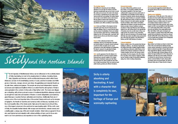 Arab , Byzantine and Norman , and its architectural treasures which reflect these influences , but also for its breathtaking scenery of coast , parched mountains and fertile groves of almonds , oranges , lemons and olives . Bougainvillaea and oleander flourish as do palm trees , walnuts and grapes . The people are proud and independent , reserved but sincere and helpful and traditions thrive to an extent that the atmosphere of Sicily is unrecognisable in the context of other parts of Italy further north . The towns and villages are contrasting , with picture postcard scenes of mediaeval labyrinthine alleyways adorned by wrought�iron balconies and baskets of flowers or severe delapidation punctuated by grand Baroque or austere Norman cathedrals and churches . Additionally there are of course some of the most important sites of the ancient Greek world such as the temples at Agrigento , the theatre at Taormina and numerous relics at Siracusa , reputedly one of the most beautiful cities of the Greek world . High above the island looms Mount Etna , one of the largest volcanoes in the world and an awe�inspiring sight . Off the north coast of Sicily , the beautiful Aeolian Islands offer escape and remoteness , natural scenery and a startling light , a sleepy way of life and romantic isolation . Sicily holds an appeal for those who want typical rest and relaxation with cultural activities at hand , and for those who want to be more adventurous and experience more of this captivating island .