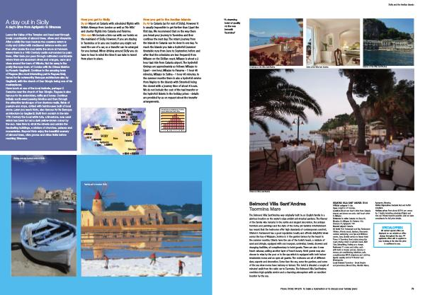 BELMOND VILLA SANT ’ ANDREA IE139 Official category 5 star . Open 2 April to 27 October . Location About one hour ’ s drive from Catania airport , and about one and a half hour ’ s drive to Milazzo . Distances in miles Catania 33 , Enna 85 , Messina 33 , Milazzo 53 , Palermo 160 , Siracusa 70 , Agrigento 142 . Nearest airport Catania . At hotel Pool Restaurant and Bar , Restaurant Oliviero , Private beach , Gardens , Panoramic outdoor swimming pool , Spa and Wellness centre , Gym , Shuttle service to Grand Hotel Timeo in Taormina , Boat cruises along the coast , Diving centre on private beach , Kids ' Club , Babysitting , Parking at a charge . Bedrooms 71 rooms and suites , each with bath or shower and wc , balcony or terrace , air�conditioning , television , safe , complimentary Wi-Fi , telephone and mini-bar . Sports nearby Golf at ‘ Il Picciolo ’ and Watersports . Local interest Taormina � Greek theatre and panoramas , Mount Etna , Giardini Naxos ,