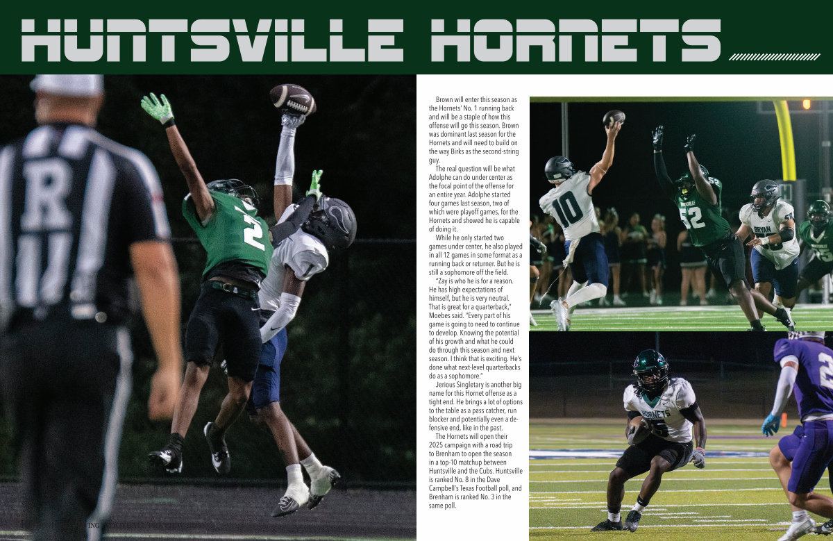The Hornets will open their 2025 campaign with a road trip to Brenham to open the season in a top-10 matchup between Huntsville and the Cubs. Huntsville is ranked No. 8 in the Dave Campbell’ s Texas Football poll, and Brenham is ranked No. 3 in the same poll.