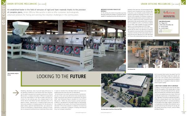 INNOVATIVE SOLUTIONS FOR RECYCLED MATERIALS On the contrary , the market of recyclates is growing decisively , boosting the prestige of companies that are capable of managing the process efficiently and com- petitively . At the same time , the technological level of products is also increasing and Union has been able to develop various innovative solutions thanks to the experience gained over decades in the sector . Just to mention a few examples , the Milanese company can deliver machines allowing the customer to obtain , from fish boxes , crystals that are then conveyed to downstream plants , also manufactured by Union , to produce the micro-pellets from which a new fish box is realised or , even better , make it possible to produce composite panels or wind turbine blades from R-PET flakes . “ Technologies that did not exist until recent times , and are also the result of the skills that our engineers have gained in many areas thanks to the development of plants of all kinds , for flat head extrusion ( even in large sizes and screw diameters up to 350 millimetres ) of 7-8 tons of bi-oriented sheets per hour . Over time ,
