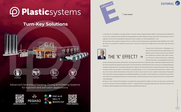 THE‘ K’ EFFECT? pandemic, and even economic downturns have all failed to dent its leadership, the situation today is different. Back in June, the German machinery manufacturers— traditionally the heart of the event— were already laying their cards on the table, pointing to weak markets, declining orders, and prospects that look far less rosy than they used to. Meanwhile, the global trade fair calendar has become packed with regional and sector-specific events that, being more streamlined and less time-consuming, are increasingly appealing to companies wanting solid results— less window dressing and more substance. Also, why wait three years to see what’ s new and meet with customers? The doubt, therefore, seems justified: is K still the beacon of this global industry, or is it on its way to becoming something more‘ ordinary’? To ask this is by no means to diminish the importance of this German fair, which remains a giant of an event, capable of attracting tens of thousands of visitors and sending out strong messages about sustainability, digitalisation and innovation. But with markets now moving faster than ever before, and companies favouring targeted interactions over lavish showcases, a mammoth eight-day event like K needs to find a way to demonstrate that it is still indispensable. Perhaps the‘ K effect’ in 2025 will be precisely this— an opportunity to gauge whether the exhibition can confirm its unique status, reinventing itself to remain the main point of reference worldwide, or whether it is instead destined to increasingly resemble other international events. Because this is the difference between legendary and conventional, between extraordinary and important.