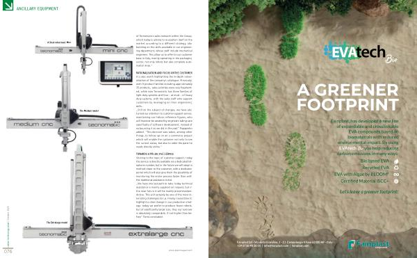 TOWARDS A PREDICTIVE SERVICE Sticking to the topic of customer support, today this service is directly available via a dedicated telephone number, but in the future we will adopt a method closer to the customer, with a dedicated portal which will also give them the possibility of monitoring the entire process faster than with the traditional assistance ticket. „ We have one last path to take: today technical assistance is mainly supplied on request, but in the near future it will be mainly preventive / predictive. This will certainly be one of the most interesting challenges for us. Finally, I would like to highlight a clear change in our production strategy: today we prefer to produce fewer robots, but of significantly larger size, thus our turnover is absolutely comparable, if not higher than before” Torrisi concluded. www. plastmagazine. it