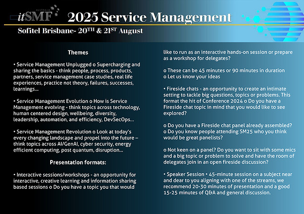 • Service Management Revolution o Look at today’s every changing landscape and propel into the future – think topics across AI/GenAI, cyber security, energy efficient computing, post quantum, disruption…
