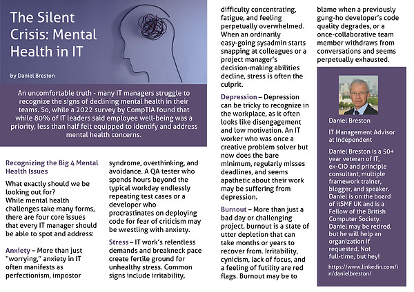 An uncomfortable truth - many IT managers struggle to recognize the signs of declining mental health in their teams. So, while a 2022 survey by CompTIA found that while 80% of IT leaders said employee well-being was a priority, less than half felt equipped to identify and address mental health concerns.