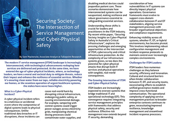 Understanding these shifts is crucial for leaders and practitioners in the ITSM industry. My recent white paper, *Securing Society: Insights on Cyber-Physical Safety in Australia’s Critical Infrastructure”, explores the pressing challenges and emerging opportunities at the intersection of ITSM, cybersecurity and critical infrastructure protection. As the complexity of our infrastructure systems grows, so too does the potential for cyber-physical attacks that disrupt both IT services and physical operations with tangible, real-world consequences.