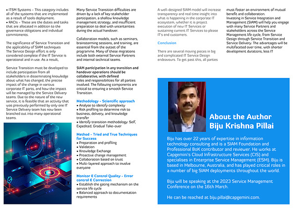 Biju has over 22 years of expertise in information technology consulting and is a SIAM Foundation and Professional BoK contributor and reviewer. He works at Capgemini's Cloud Infrastructure Services (CIS) and specialises in Enterprise Service Management (ESM). Biju is based in Melbourne, Australia, and has played critical roles in a number of big SIAM deployments throughout the world.