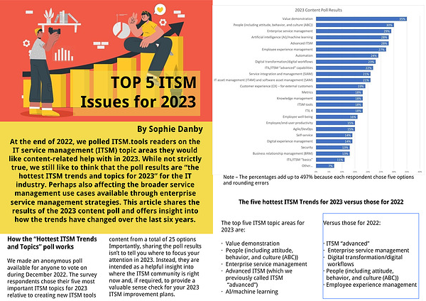 content from a total of 25 options Importantly, sharing the poll results isn’t to tell you where to focus your attention in 2023. Instead, they are intended as a helpful insight into where the ITSM community is right now and, if required, to provide a valuable sense check for your 2023 ITSM improvement plans.