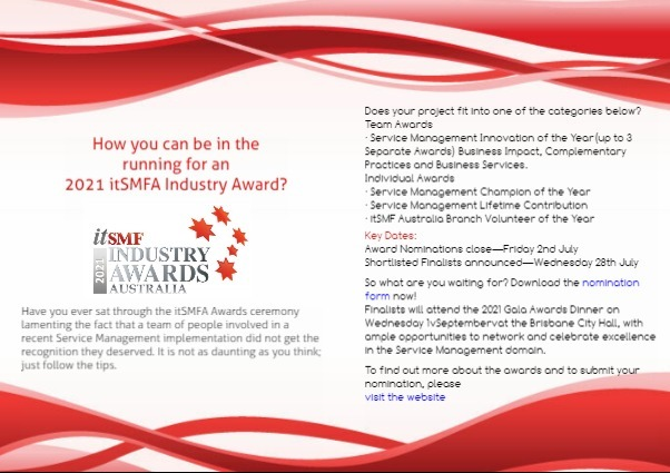 Finalists will attend the 2021 Gala Awards Dinner on Wednesday 1vSeptembervat the Brisbane City Hall, with ample opportunities to network and celebrate excellence in the Service Management domain.