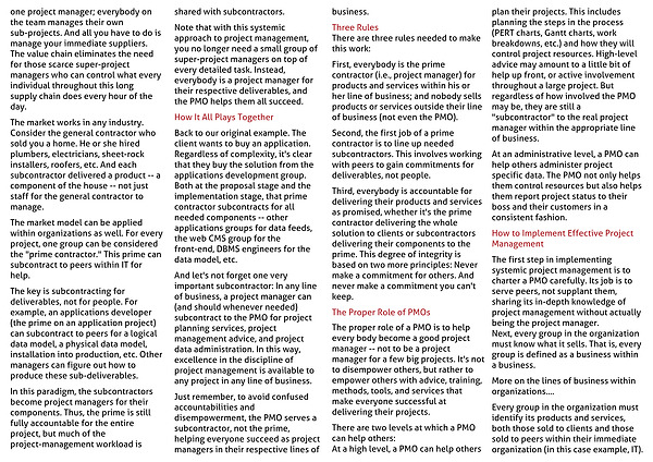 And let's not forget one very important subcontractor: In any line of business, a project manager can (and should whenever needed) subcontract to the PMO for project planning services, project management advice, and project data administration. In this way, excellence in the discipline of project management is available to any project in any line of business.
