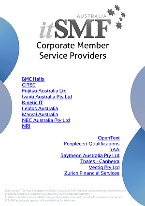 Disclaimer: IT Service Management Forum Australia (ITSMFA) does not endorse or recommend the products, services, or commercial solutions of any Corporate Member.