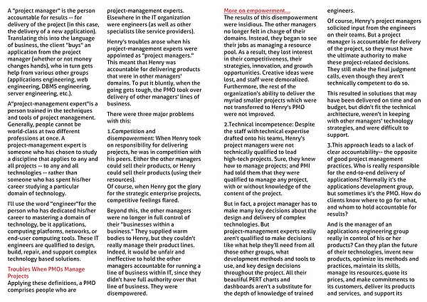 2. Technical incompetence: Despite the staff with technical expertise drafted onto his teams, Henry's project managers were not technically qualified to lead high-tech projects. Sure, they knew how to manage projects; and PMI had told them that they were qualified to manage any project, with or without knowledge of the content of the project.