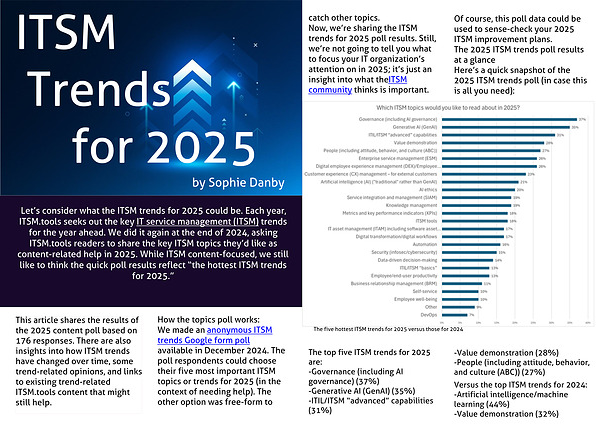 This article shares the results of the 2025 content poll based on 176 responses. There are also insights into how ITSM trends have changed over time, some trend-related opinions, and links to existing trend-related ITSM.tools content that might still help.